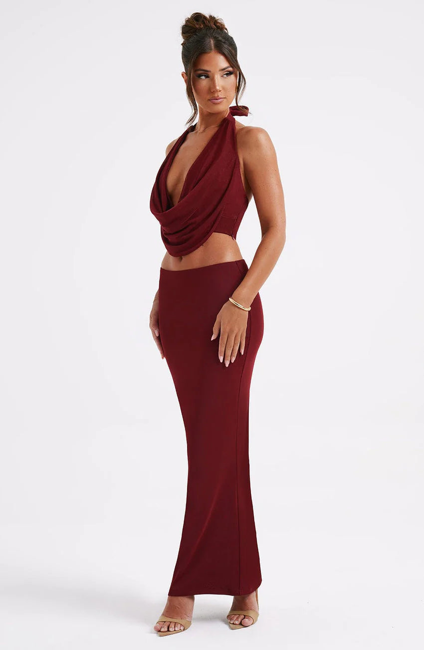 Get that IT girl energy in the Chrishelle top, designed with a cool, draped halter cut. The top is complete with plunge neck, backless detail and looks perfect paired with the matching Chrishelle maxi skirt, metallic accessories and minimal heels.