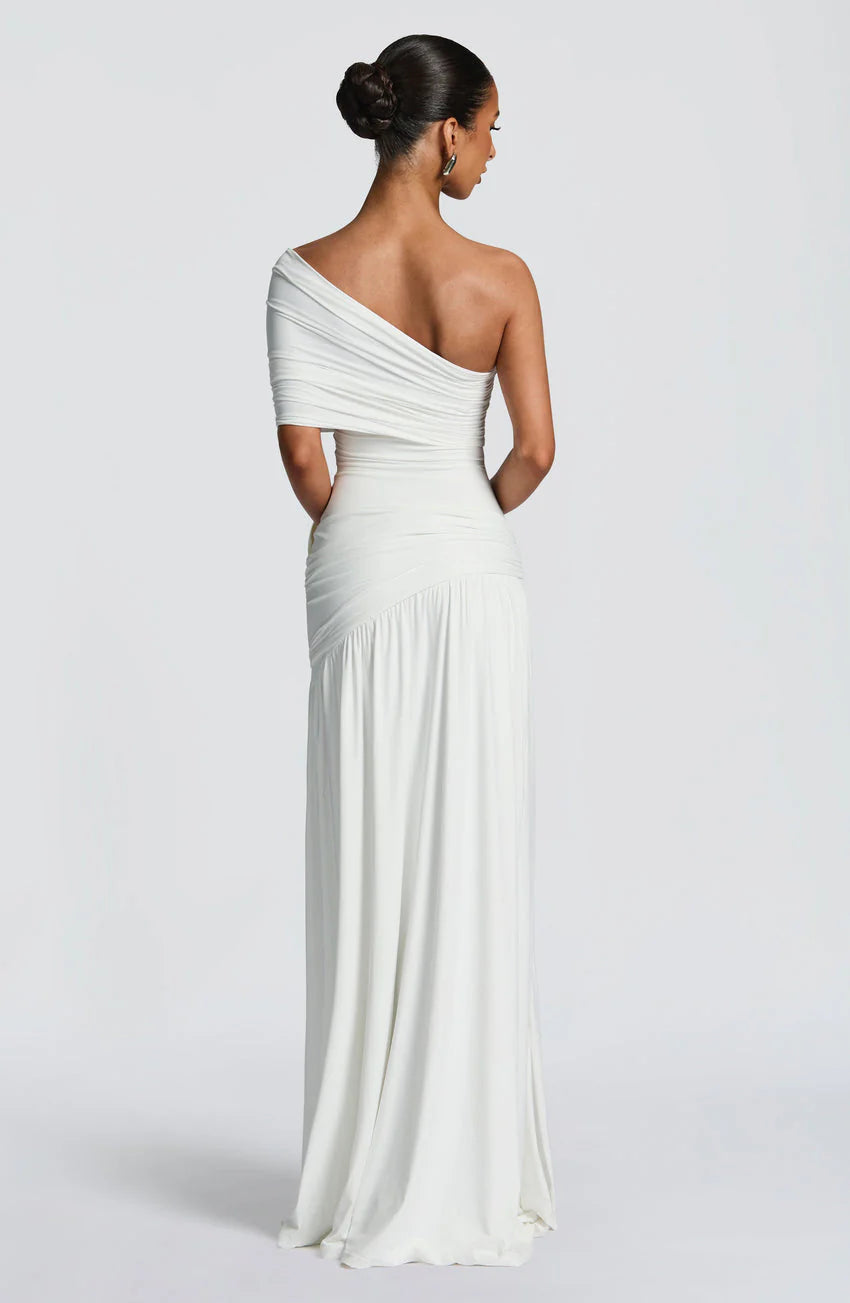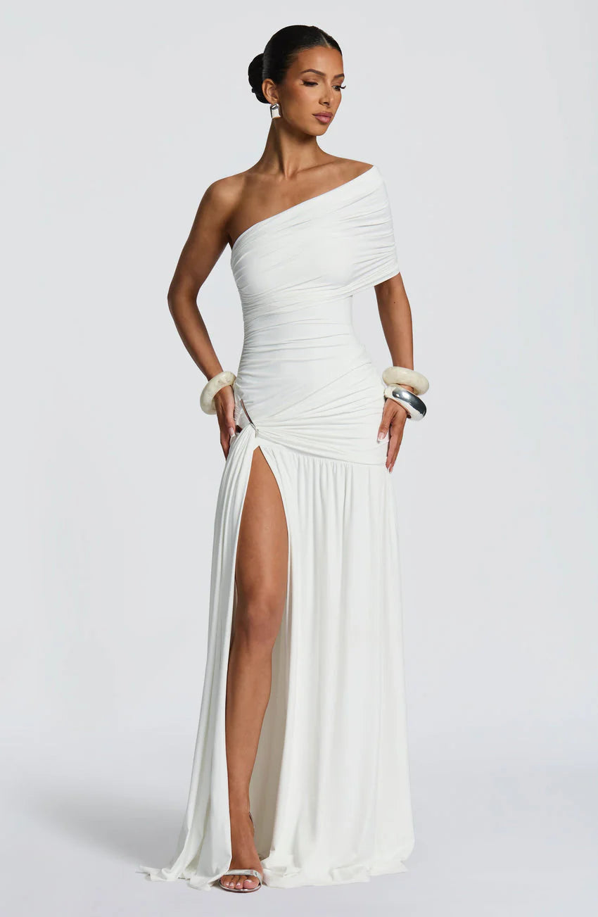The Monica Maxi Dress in white showcases a one-shoulder Bardot neckline, asymmetric pleating, and a silver-tone buckle detail, with a flowing skirt and thigh-high split for a sophisticated look.