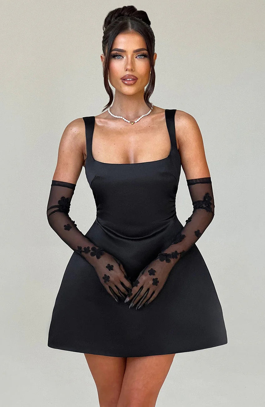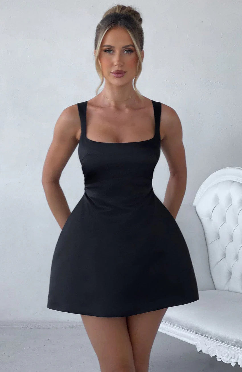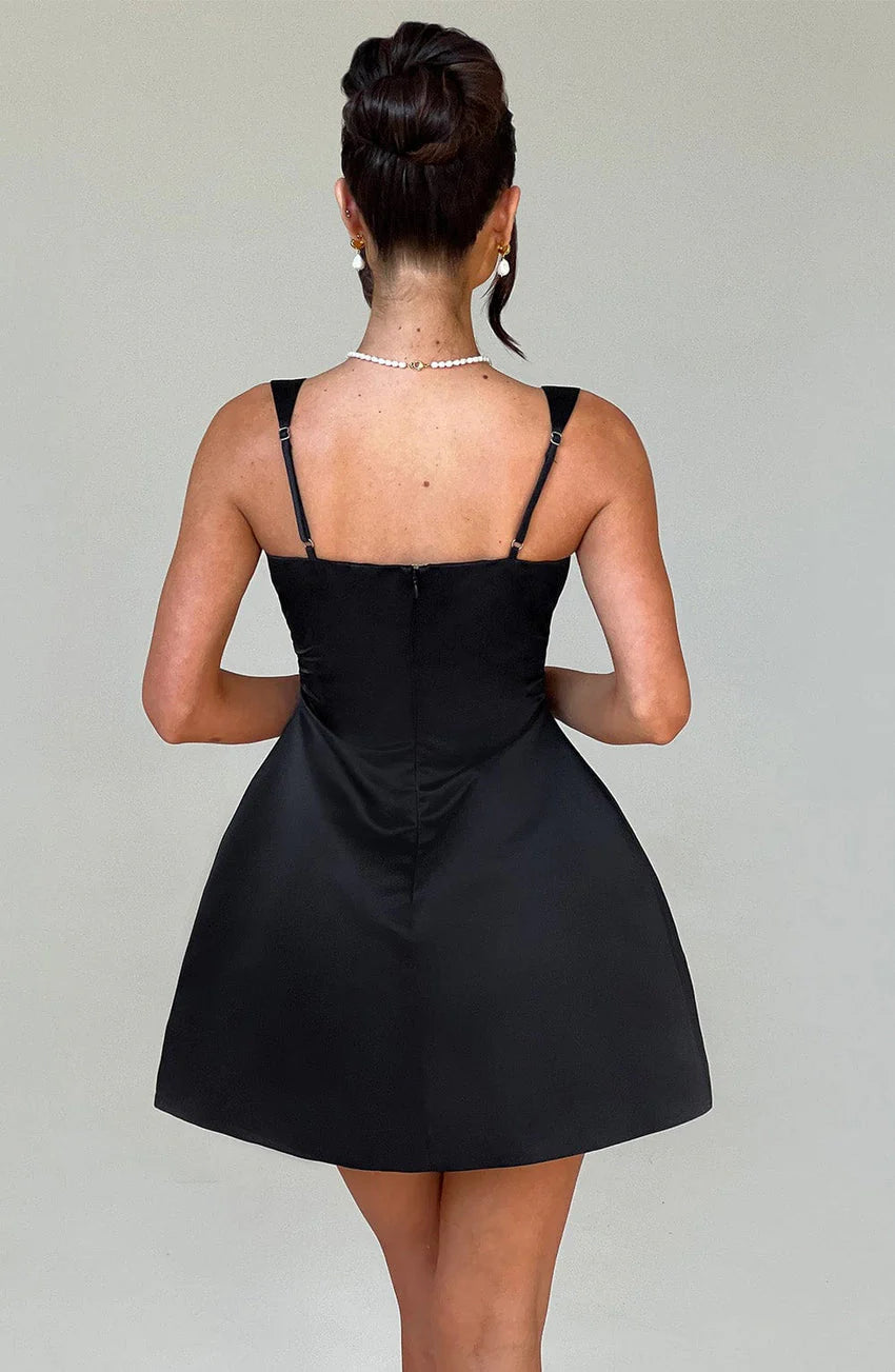 The chicest mini of the moment, Sofie in Black is cut from our luxe satin fabric with a lustrous sheen. It has a fun, bubble shaped skirt, complemented by a snatched waist and square neckline. The look is complete with fan shaped straps which are adjustable for your perfect fit.