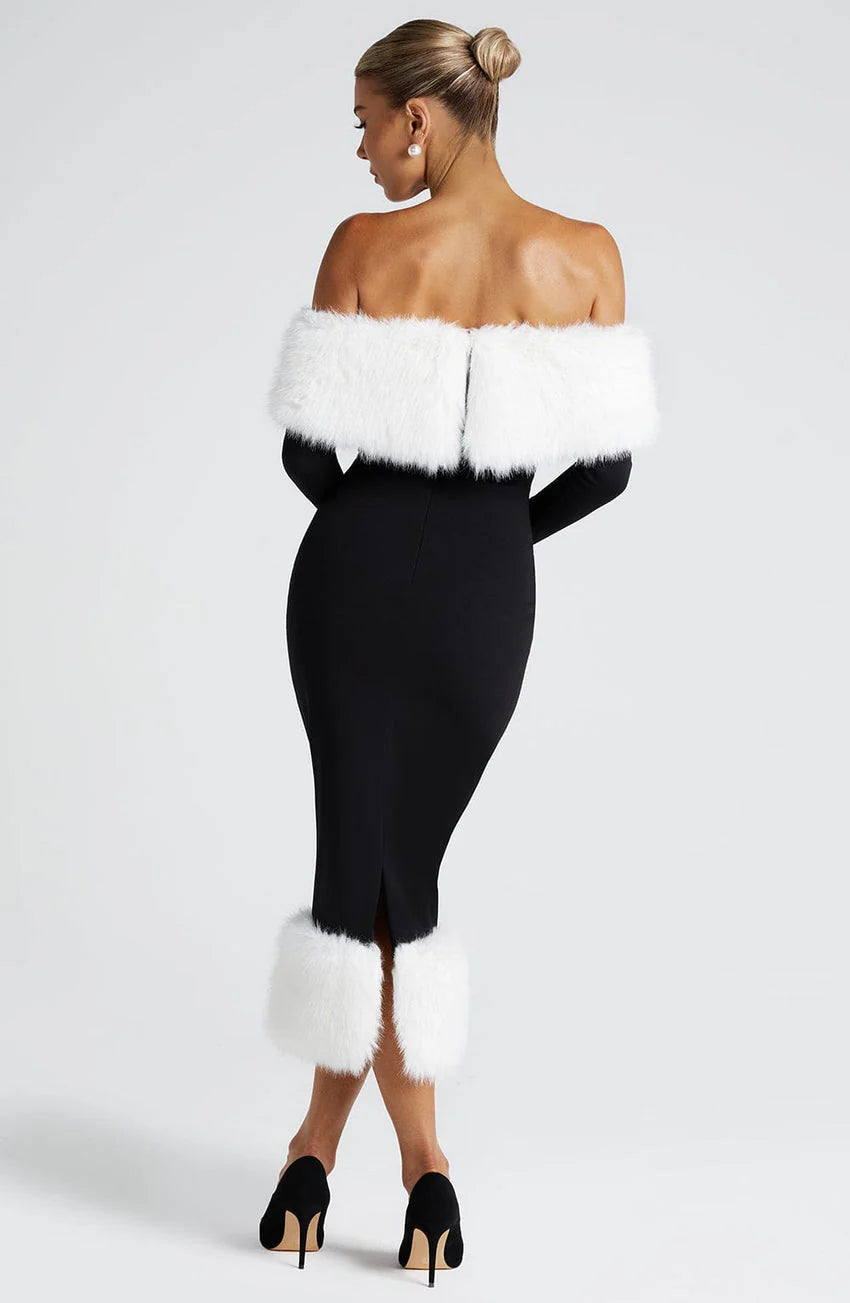 The Vittoria Midi Dress in Black/White exudes timeless elegance. Crafted from luxurious stretch crepe, this bodycon dress features a flattering bardot neckline that beautifully frames the shoulders, while the contrast faux fur detailing on the neckline and hem adds a touch of opulence. The long sleeves and pencil-shaped skirt provide a sleek silhouette.